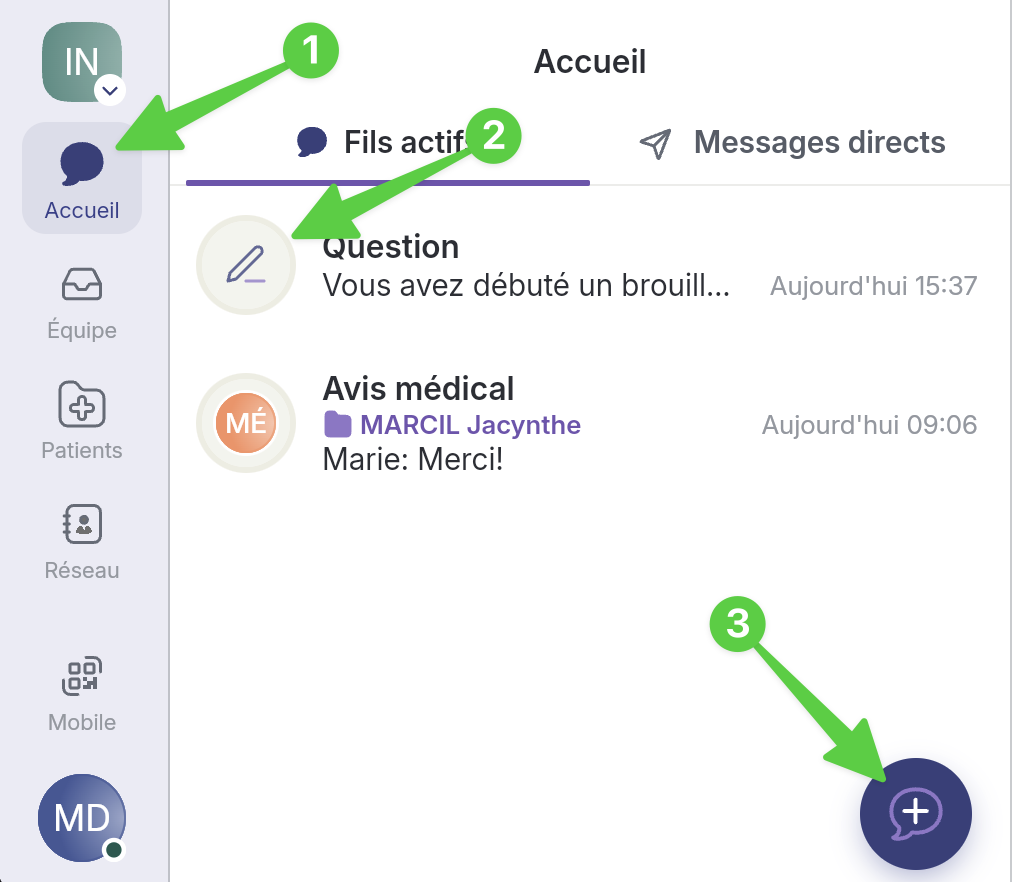 **1) Accédez à la page&#x20;*****Accueil,*****&#x20;puis 2) accédez à un brouillon ou 3) débuter la rédaction d'un nouveau message.**&#x20;